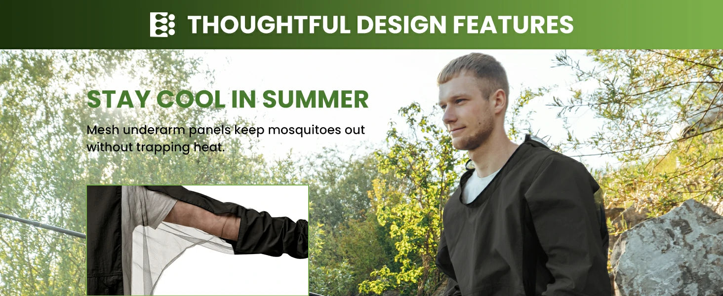 The mesh is designed to be sting-proof. By using the adjustable drawstrings at the hood, wrists, and hem, you create a secure "safety gap" between the mesh and your skin, making it impossible for insects to reach you.